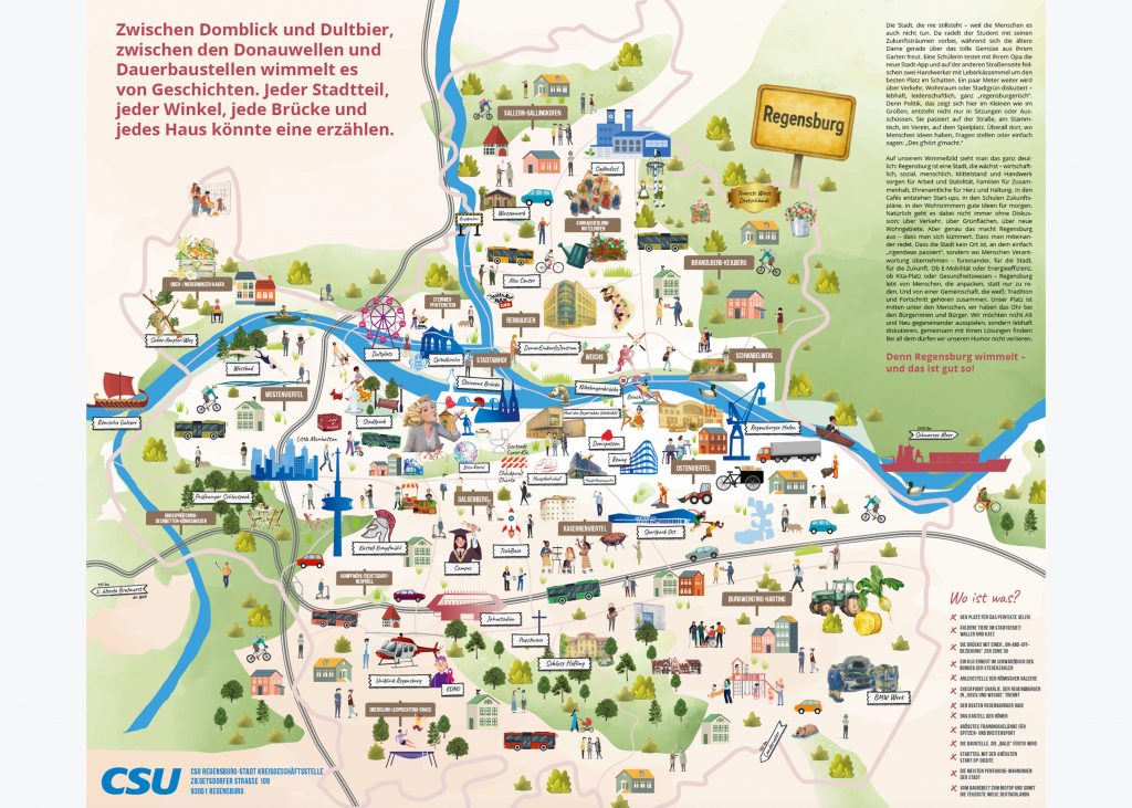 Auf unserem Wimmelbild sieht man das ganz deutlich: Regensburg ist eine Stadt, die wächst – wirtschaftlich, sozial, menschlich. Mittelstand und Handwerk sorgen für Arbeit und Stabilität, Familien für Zusammenhalt, Ehrenamtliche für Herz und Haltung. In den Cafés entstehen Start-ups, in den Schulen Zukunftspläne, in den Wohnzimmern gute Ideen für morgen.