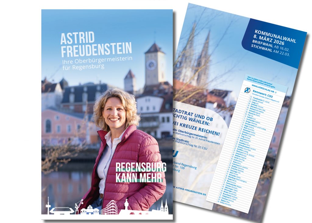 20.03.2025: In großer Geschlossenheit hat die Regensburger CSU die Weichen für die Oberbürgermeisterwahl 2026 gestellt. Zur Kandidatin für die Wahl am 8. März 2026 wurde mit 94% Bürgermeisterin Astrid Freudenstein gewählt. (ganzer Artikel)