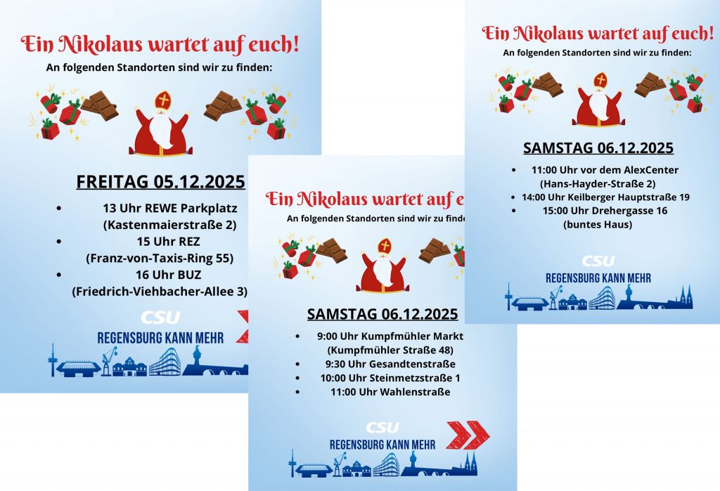 Am Freitag, 05.12., und Samstag, 06.12. führt die CSU Regensburg eine festliche Verteilaktion im gesamten Stadtgebiet durch. An 11 Standorten werden kostenlose Schokonikoläuse an Passantinnen und Passanten verschenkt, um in der Vorweihnachtszeit Freude zu verbreiten und den direkten Austausch vor Ort zu fördern. Amtierende Stadträte und die, die es werden wollen sind an beiden Tagen an den Standorten präsent und freuen sich auf kurze Gespräche, sowie den direkten Austausch mit Interessierten. „Mit dieser kleinen Geste möchten wir den Menschen in unserer Stadt eine vorweihnachtliche Freude bereiten“, sagt Michael Lehner, Kreisvorsitzender der CSU Regensburg-Stadt.