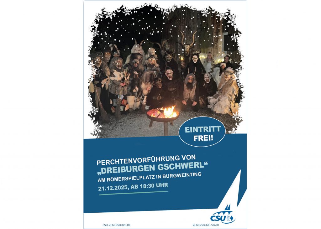 Wir laden Euch herzlich zur Perchtenvorführung von „Dreiburgen Gschwerl“ am 21.12. ab 18:30 Uhr am Römerspielplatz in Burgweinting ein! (ggü. der Otto-Schwerdt-Mittelschule, Kirchfeldallee 6, 93055 Regensburg)