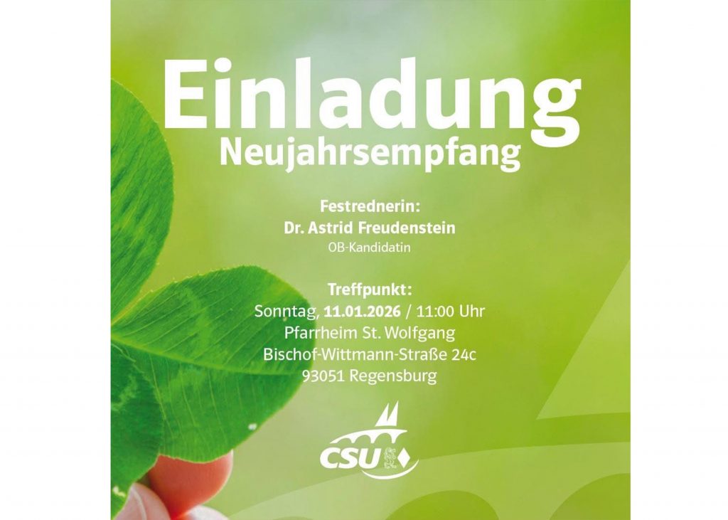 Herzliche Einladung zum Neujahrsempfang der CSU im Stadtnorden. Als Festrednerin konnten wir in diesem Jahr unsere Bürgermeisterin und OB-Kandidatin Dr. Astrid Freudenstein gewinnen.