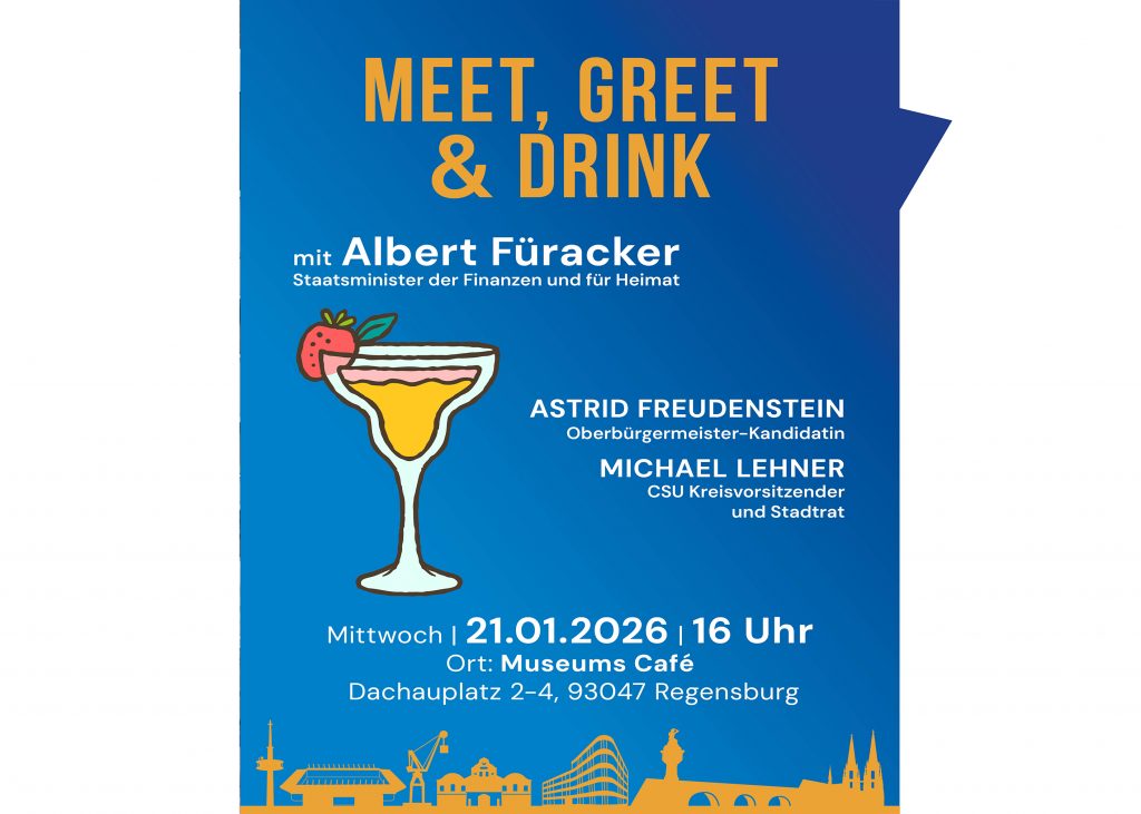Am 21. Januar um 16 Uhr besucht uns Albert Füracker im Regensburger Museums Café. Er gibt Einblicke zu den politischen Entwicklungen in Bayern und beantwortet in entspannter Atmosphäre beim MEET, GREET & DRINK Eure Fragen. Kommt vorbei und diskutiert mit!